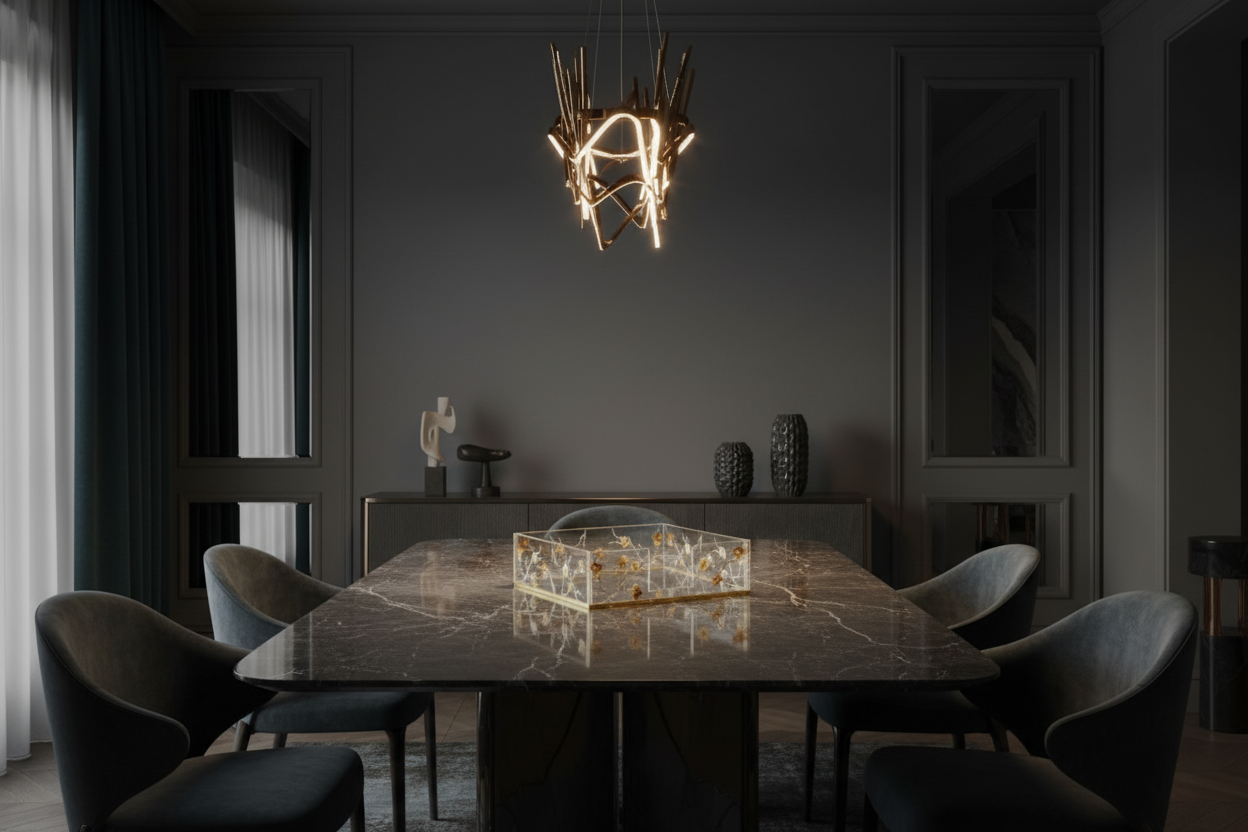 This clear acrylic holder is enhanced with stunning floral branches in silver and gold. This is one statement piece will add beauty to any tablescape!