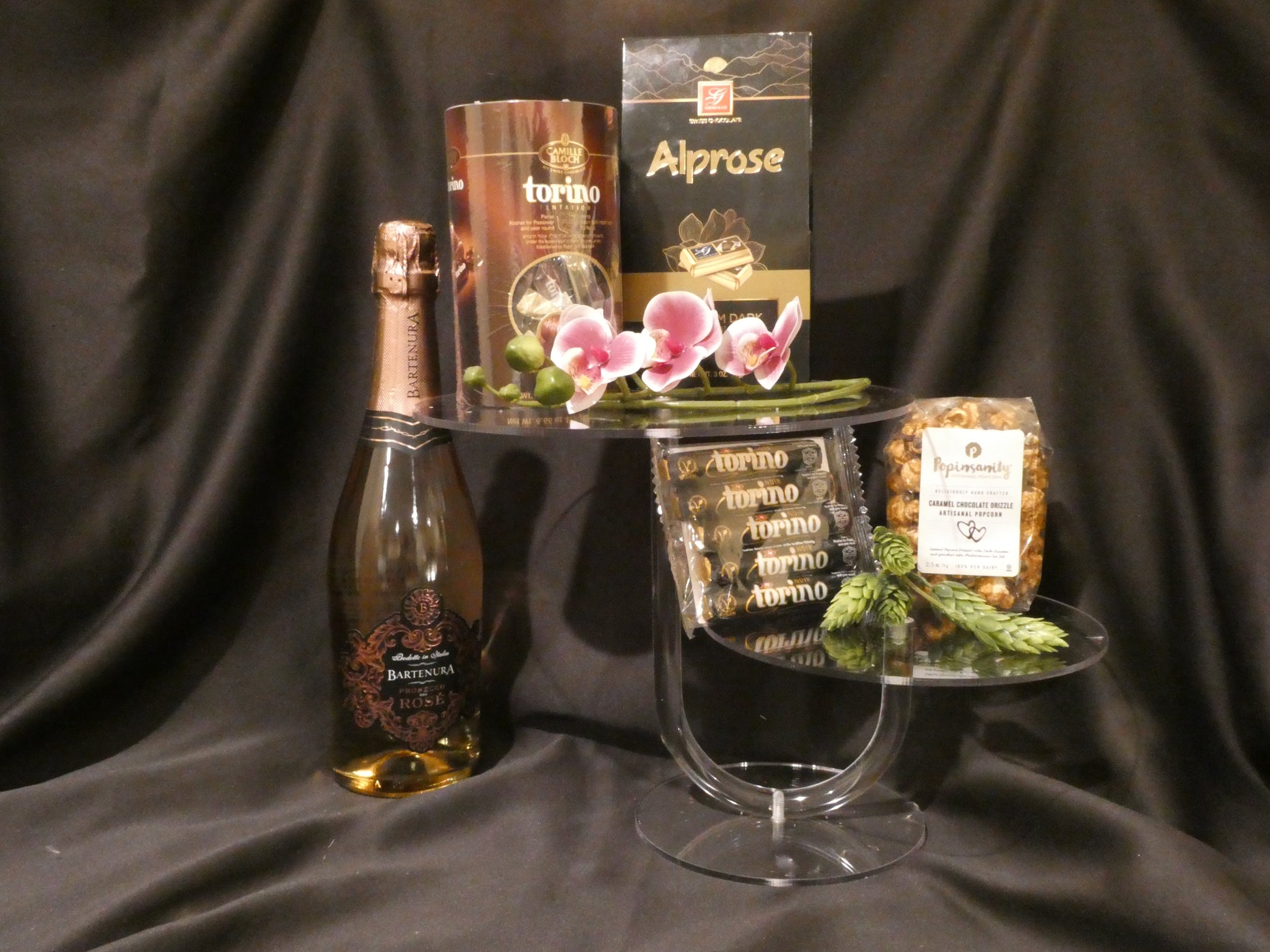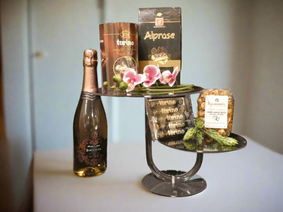 Elegant and understated, our stunning lucite cake stand has two staggered tiers, with a modern curved stand. Complete with gourmet goodies this classy and beautiful gift is sure to impress!