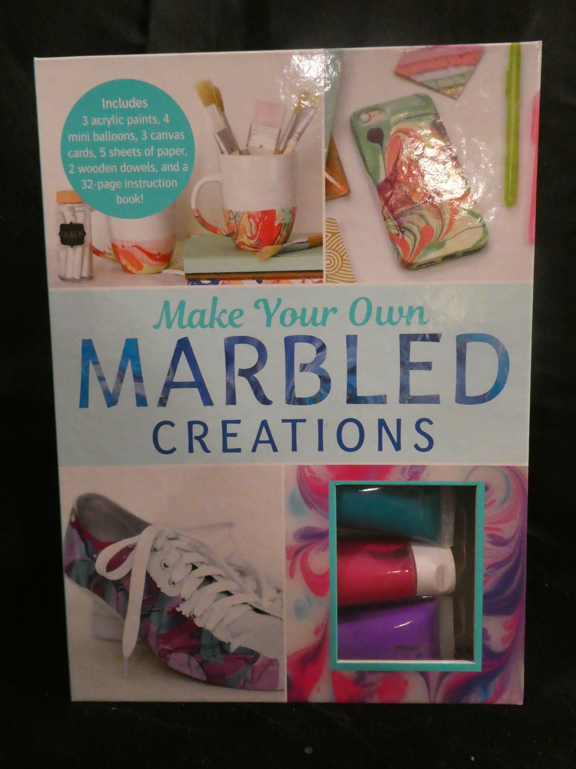 Step into the mesmerizing world of marbled art with this complete creative kit! A beautifully designed guidebook walks you through every step with gorgeous photography and easy-to-follow instructions. You'll learn the art of color selection, discover different paint types and their magic, and explore how to marble on paper, fabric, food, and more. The kit includes items to begin you marbling adventure: three acrylic paints in stunning colors, specialty marbling papers, blank canvas cards, and additional supplies ready to inspire your next masterpiece. Perfect for creative souls of all ages—whether you're a curious beginner, a crafty teen, or an experienced maker—this kit invites you to experiment, play, and transform ordinary surfaces into extraordinary works of art.