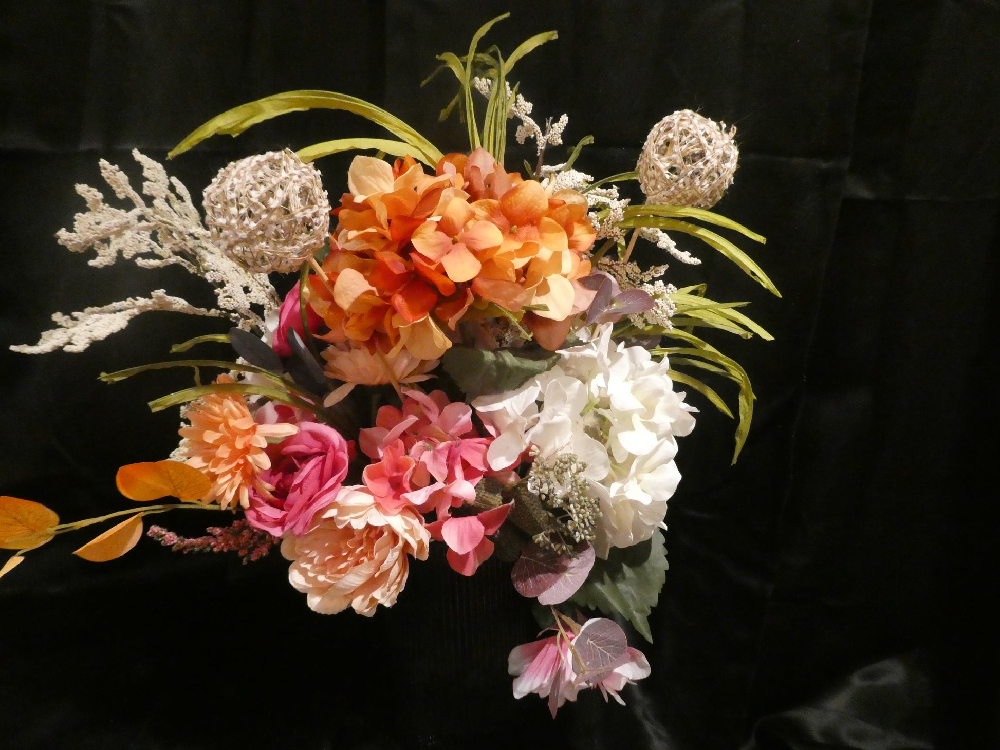 Brighten any space with this stunning floral arrangement standing in a sleek black fluted glass vase. Vibrant orange blooms dance alongside soft baby pink and creamy tones, while graceful green leaves add height and dimension to create visual intrigue. This generous bouquet strikes the perfect balance between cheerful and sophisticated—ideal for gifting or treating yourself to a moment of everyday luxury. A delightful way to bring warmth and elegance into your home.
